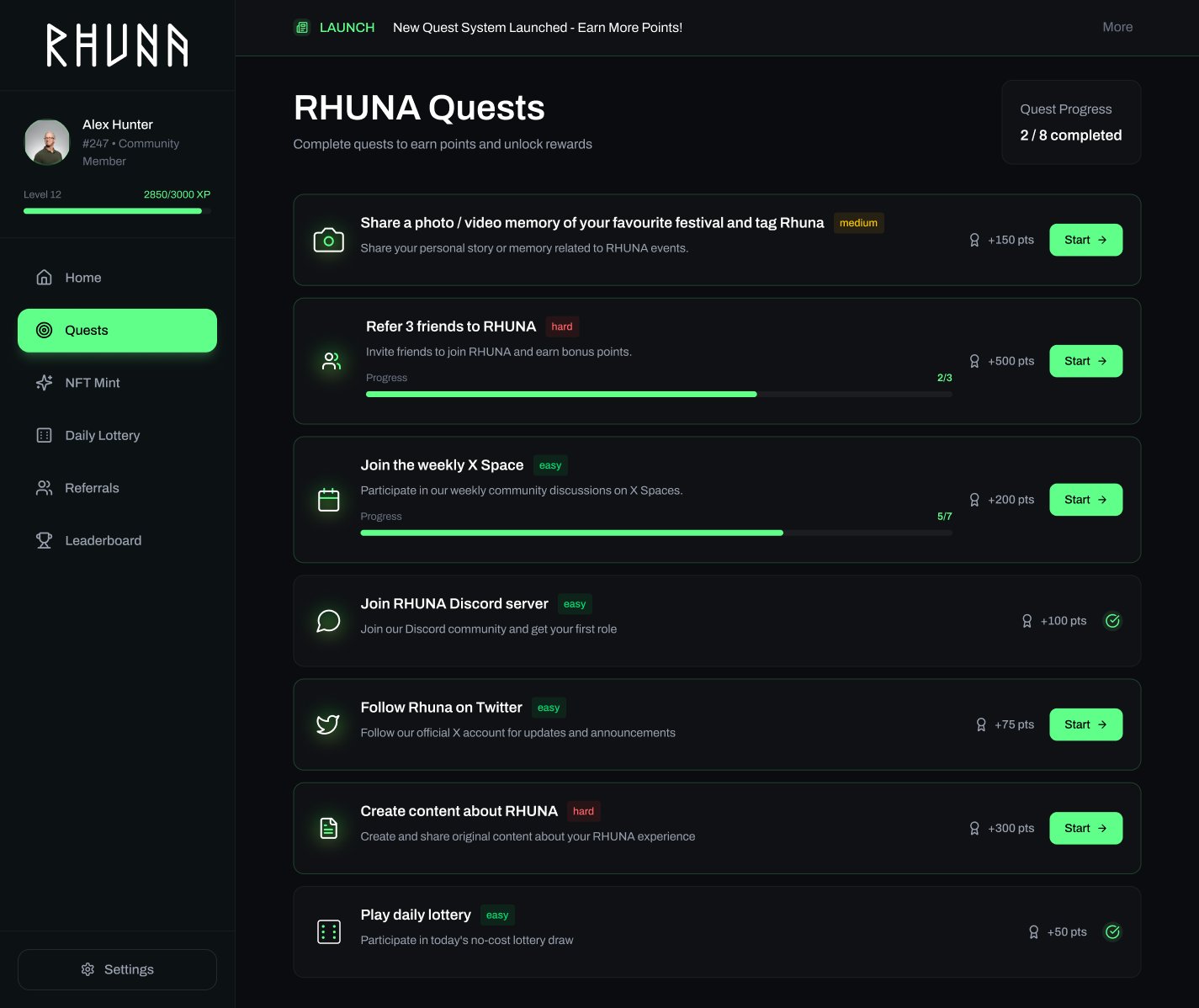 Follow @RhunaOfficial on X (100 points), join Telegram (50 points), retweet pinned posts (150 points).