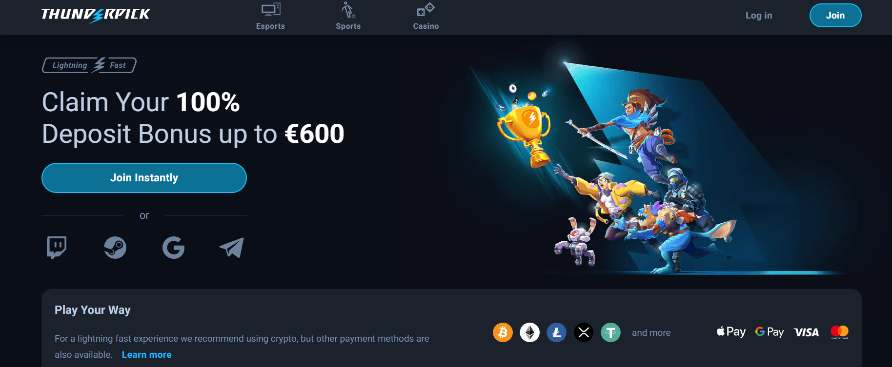 Thunderpick is crypto-first for fast, anonymous transactions. Supports BTC, ETH, LTC, XRP, USDT, BCH. Instant deposits, quick withdrawals (up to €100,000/week for major coins). No fees. Fiat options are limited. Buy crypto on-site possible.