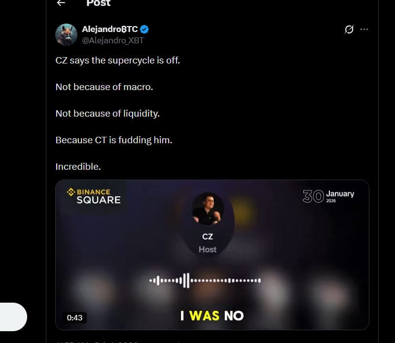 Community accounts ran with it hard; posts like “CZ says the 4-year cycle is DEAD, we’re in a SUPERCYCLE” got massive traction when BTC was hovering around $80K.