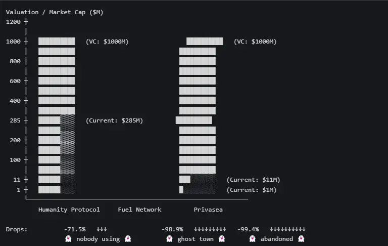 - Humanity Protocol ($1 billion in VC valuation) at $285 million cap (-71.5 percent),